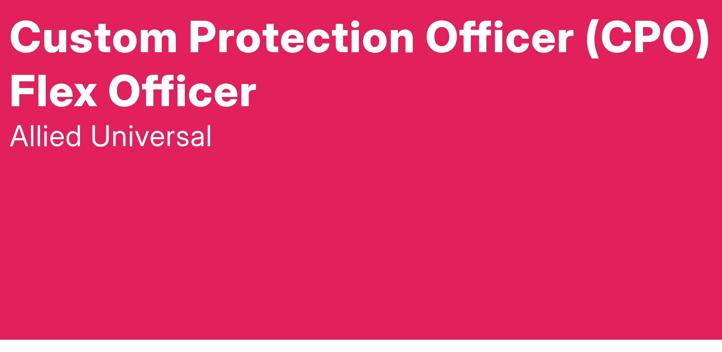 Allied Universalยฎ is hiring a Custom Protection Officer (CPO) Flex Officer. The Custom Protection Officer Flex Officer will conduct armed and/or unarmed foot and/or vehicle patrol (interior and/or exterior). Additional duties include control access and egress; monitor CCTV and alarm systems; compose reports; deter criminal activity and misconduct. The Custom Protection Flex Officer will work at various assignments and may be called upon to work irregular shifts at times with little to no advance notice.