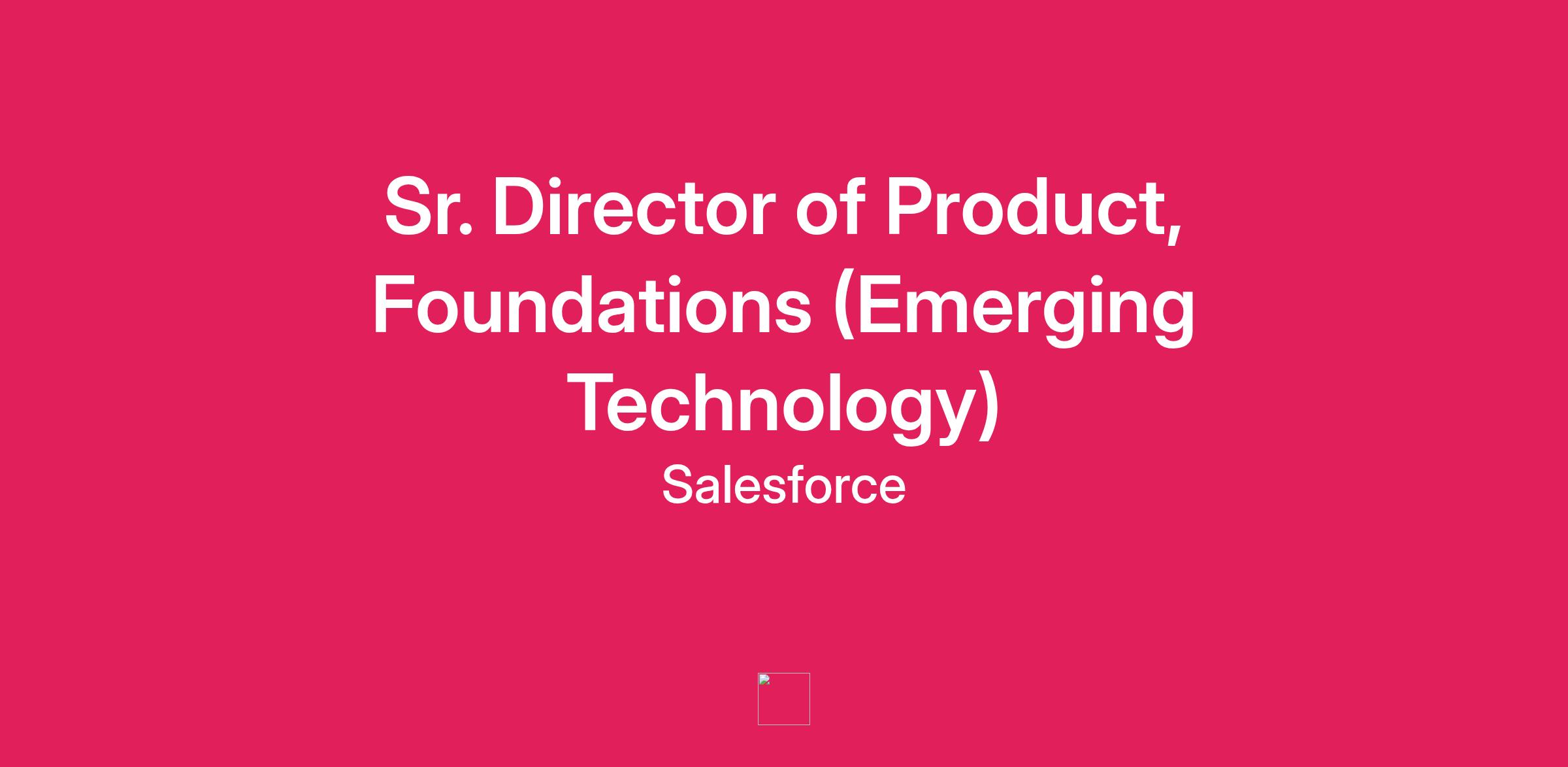 Weβre hiring a senior product leader to own the foundational technology strategy that enables the DET organization and beyond at Salesforce. This role focuses on platforms, shared tooling, data foundations, and cloud infrastructure that improve reliability, speed to market, and developer productivity. This role reports to the SVP of Emerging Technology and partners closely with the VP, Product, Emerging Technology.