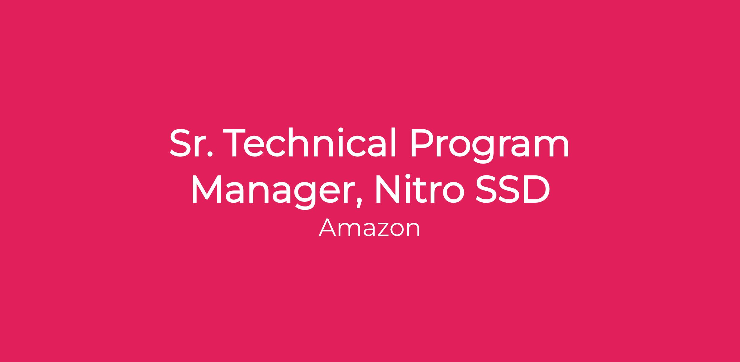 What you will do: As a Sr. TPM on the Nitro SSD team you will be responsible for leading multiple simultaneous storage product development programs in a highly cross-functional environment which includes internal customers and hardware/software development teams, external vendors and technology partners. Youβll provide technical leadership in the application of new technologies to large scale NAND-based storage solutions development and deployment in a continuous effort to deliver a world-class customer experience at a world-class cost point. This is a fast-paced, intellectually challenging position, and youβll work with thought leaders in multiple technology areas. Youβll have high standards for yourself and everyone you work with, and youβll be constantly looking for ways to improve your productβs performance, quality and cost. Using data and key metrics, you will also drive and measure process improvements that enhance our operational effectiveness. You will work independently in a dynamic, challenging, and fast-changing organization. Weβre changing an industry, and we need individuals who are ready for this challenge and who want to reach beyond what is possible today. Prior experience in building and scaling solid-state-drives or storage solutions is a definite plus.