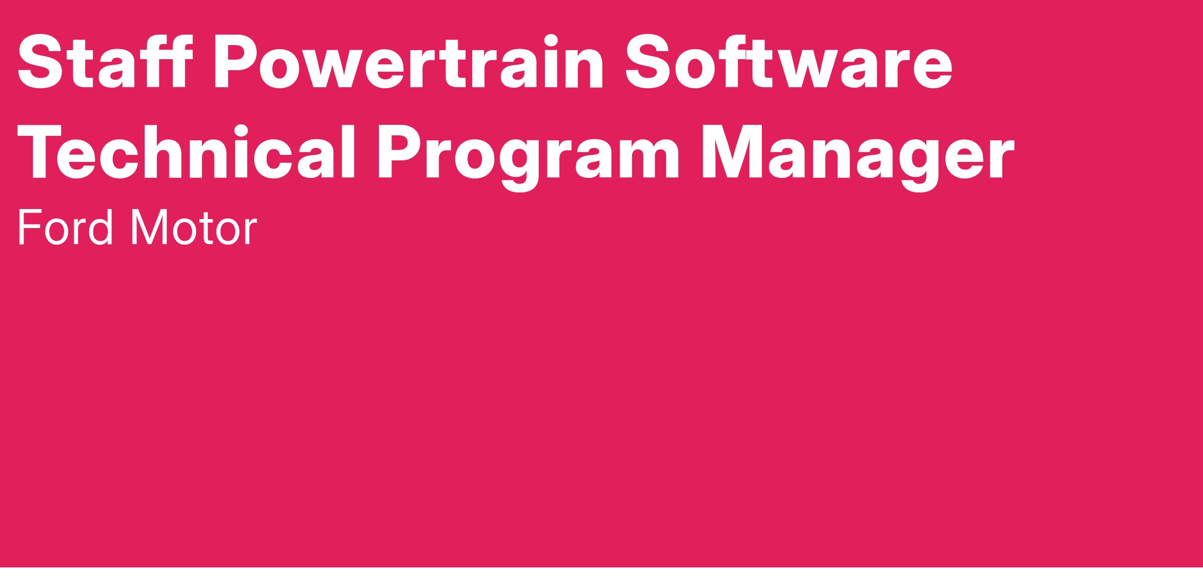 Ford is seeking an experienced Software Technical Program Manager (TPM) for Powertrain and Motion Controls. The TPM will be responsible for driving the team to meet their committed deliverables as well as working with the engineers, technical leads, and managers across the broader organization to assess risk, communicate status, and drive closure to key issues. The ideal candidate will have a strong technical background in automotive powertrain systems and motion controls, excellent project management skills, and experience working with highly cross-functional teams. This environment is not for everyone but will enrich the best talent with the opportunity to perform some of the best work of their careers. Β