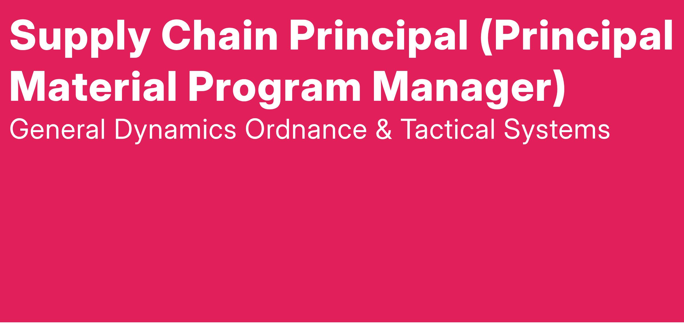 General Dynamics Ordnance and Tactical Systems (GD-OTS), a premier provider to the US Department of Defense and allied nations, is seeking a Supply Chain Principal (Principal Material Program Manager), with experience in the defense/aerospace industry, to join our Folsom or Healdsburg, California team.Β